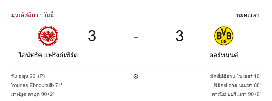 ศึกฟุตบอล บุนเดสลีกา ที่ดอยซ์แบงก์ พาร์ค กลายเป็นหนึ่งในเกมมันส์ประจำสัปดาห์ เมื่อไอน์ทรัค แฟรงก์เฟิร์ต เปิดบ้านเสมอ โบรุสเซีย ดอร์ทมุนด์ แบบสุดเดือด 3-3 เกมนี้บอลไหลไปมาทั้งสองฝั่ง สกอร์พลิกถึงสามรอบ และต้องรอถึงช่วงทดเจ็บถึงรู้ผล แฟนบอลที่ตามเช็ก ผลบอลสด อยู่มีหัวใจหล่นไปกองกับพื้นแน่นอน