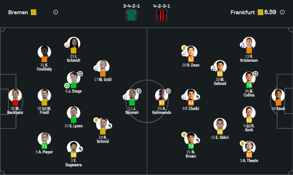 อย่างไรก็ตาม ฝั่งแฟร้งค์เฟิร์ตใช้การเข้าปะทะดุดัน ฟาวล์ถึง 14 ครั้ง เทียบกับเบรเมนเพียง 7 ครั้ง และโดนใบเหลืองถึง 4 ใบ ในขณะที่เจ้าบ้านโดนแค่ 1 ใบ เกมยังเห็นความแตกต่างเรื่องลูกตั้งเตะ เบรเมนได้เตะมุมมากกว่า 4 ต่อ 1 แต่กลับปิดเกมไม่ได้ กลายเป็นว่าความเฉียบคมในช่วงท้ายและความไม่ยอมแพ้ของทีมเยือนทำให้สถิติที่เหนือกว่าของเบรเมนไม่พอจะเปลี่ยนเป็นสามแต้มเต็ม