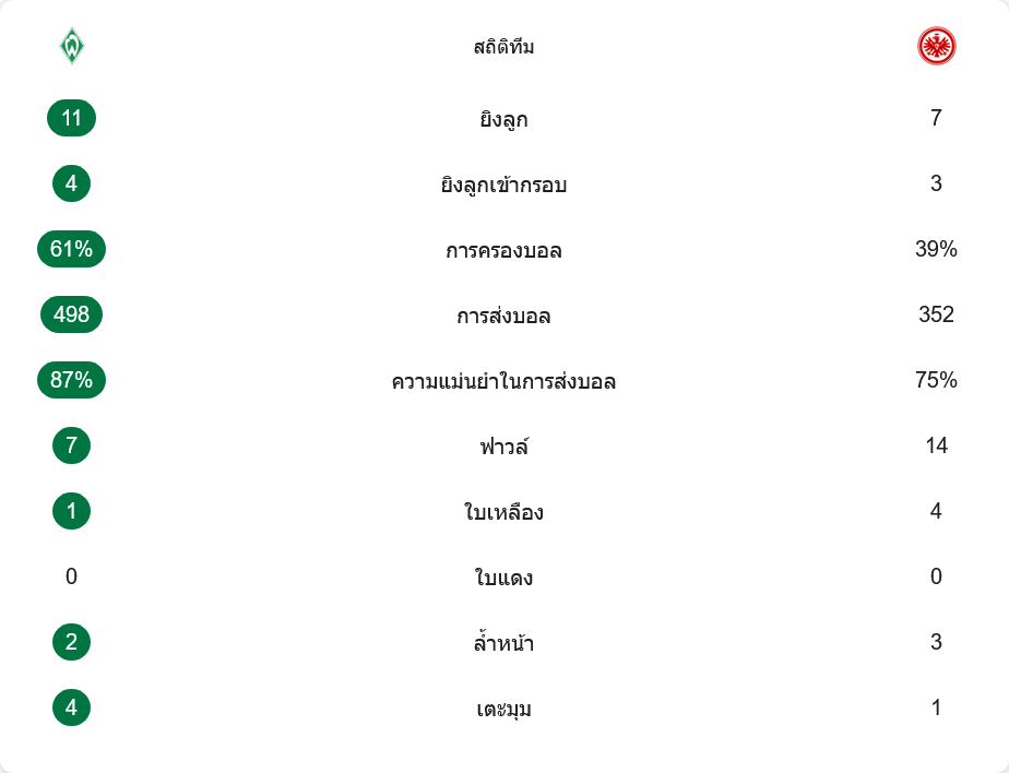ตัวเลขบอกชัดว่าเบรเมนครองจังหวะในบ้านได้เหนือกว่า ยิงรวม 11 ครั้ง เข้ากรอบ 4 ครั้ง มากกว่าแฟร้งค์เฟิร์ตที่ยิง 7 ครั้ง เข้ากรอบ 3 ครั้ง การครองบอลเบรเมนสูงถึง 61% เปรียบเทียบกับ 39% ของทีมเยือน ส่งบอลมากถึง 498 ครั้ง ด้วยความแม่นยำ 87% ขณะที่แฟร้งค์เฟิร์ตส่ง 352 ครั้ง แม่นยำ 75% แสดงให้เห็นว่าเจ้าถิ่นคุมบอลและคุมจังหวะเกมได้ดี
