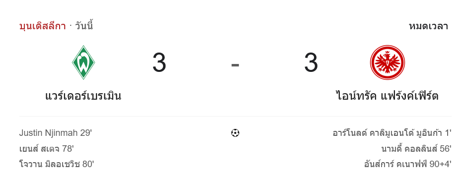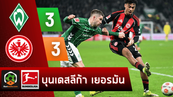 จบเกม แวร์เดอร์ เบรเมน เสมอ ไอน์ทรัค แฟร้งค์เฟิร์ต 3-3 แบ่งกันไปทีมละแต้ม แต่แฟนบอลได้ความมันส์เต็มเม็ดเต็มหน่วย
