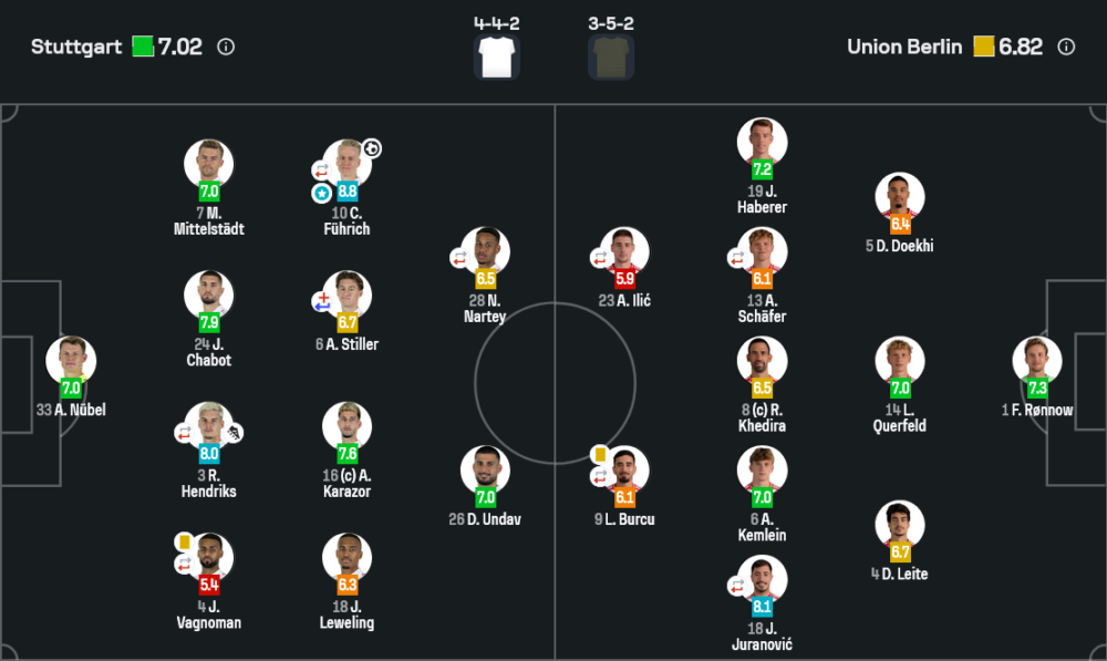 ท้ายเกมสตุ๊ตการ์ทเปลี่ยนรวด 3 คน นาที 90 ส่งคาร์ลอส อันเดรส, โลเรนซ์ อาซซินญง และเจเรมี อาเรวาโล ลงมาแทนสติลเลอร์, เฮนดริกส์ และแวกโนมัน เพื่อเติมความสดลุยช่วงทดเวลา ขณะที่อูนิโอนก็ถอดอีลิชให้โอลิเวอร์ เบิร์ก นาที 90+2