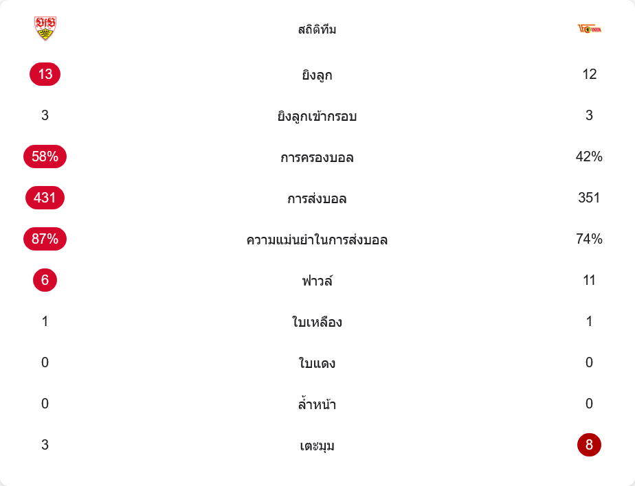 เมื่อมองตัวเลขแล้วจะเห็นว่าสตุ๊ตการ์ทเล่นได้เหนือกว่าเล็กน้อย เจ้าถิ่นยิงทั้งหมด 13 ครั้ง เข้ากรอบ 3 ครั้ง เท่ากับอูนิโอนที่ยิง 12 ครั้ง เข้ากรอบ 3 ครั้ง แต่สตุ๊ตการ์ทครองบอลถึง 58% ต่อ 42% ของทีมเยือน ส่งบอลสำเร็จกว่า 431 ต่อ 351 ครั้ง และมีความแม่นยำในการจ่ายถึง 87% ขณะที่อูนิโอนได้ 74% ทำให้รูปเกมส่วนใหญ่บอลอยู่กับเท้าของแข้งม้าขาว