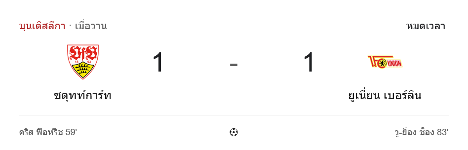 ศึกบุนเดสลีกาคืนนี้ที่เมอร์เซเดส-เบนซ์ อารีนา สตุ๊ตการ์ทเปิดบ้านรับการมาเยือนของอูนิโอน เบอร์ลิน กลายเป็นอีกหนึ่งเกมที่คอเช็ก ผลบอลสด ต้องลุ้นกันจนวินาทีสุดท้าย เจ้าถิ่นได้ประตูขึ้นนำจากลูกยิงไกลสุดคมของคริส ฟือห์ริช ก่อนโดน วู-ยอง จอง ตัวสำรองทีมเยือนซัดตีเสมอนาที 83 จบเกมแบ่งแต้ม 1-1 ชนิดแฟนเจ้าบ้านมีเซ็ง เพราะโอกาสปิดเกมมีเพียบแต่ไม่คมพอ