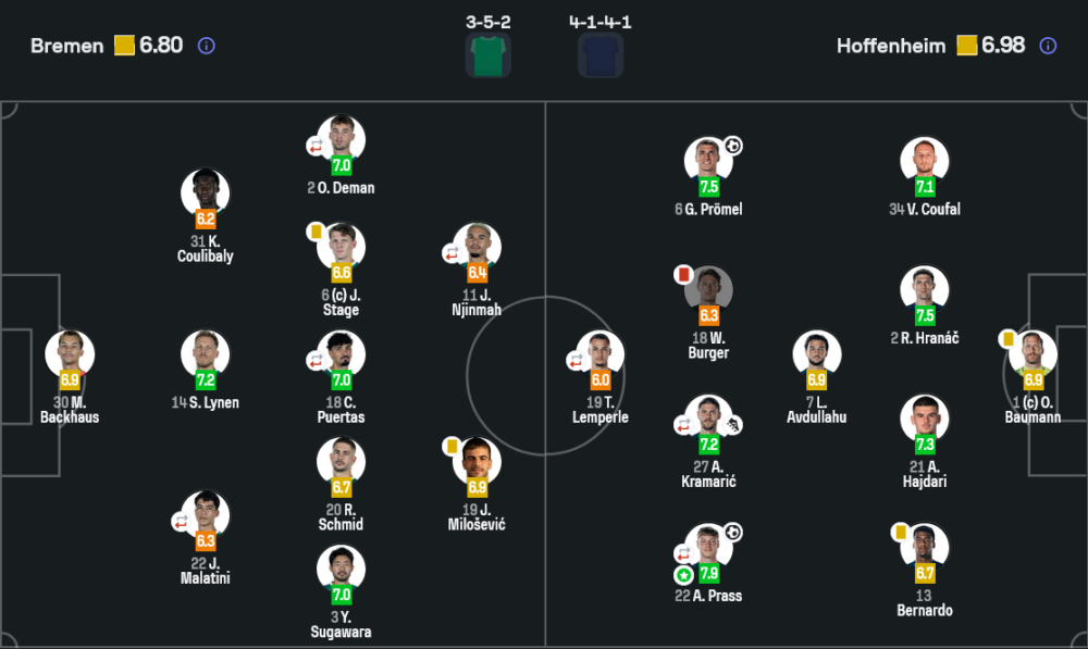 ผู้เล่นเด่นฝั่งฮอฟเฟ่นไฮม์นอกจากพราสส์ยังมี โพรเมิล และ ฮรานัช ที่ต่างได้เรตติ้งสูงสุด 7.5 ขึ้นไป ขณะที่ฝั่งเบรเมน ตัวสำรองอย่างกรึลล์กับเอ็มบังกูลาเป็นคนดึงเกมรุกให้มีชีวิตชีวาในช่วงท้าย