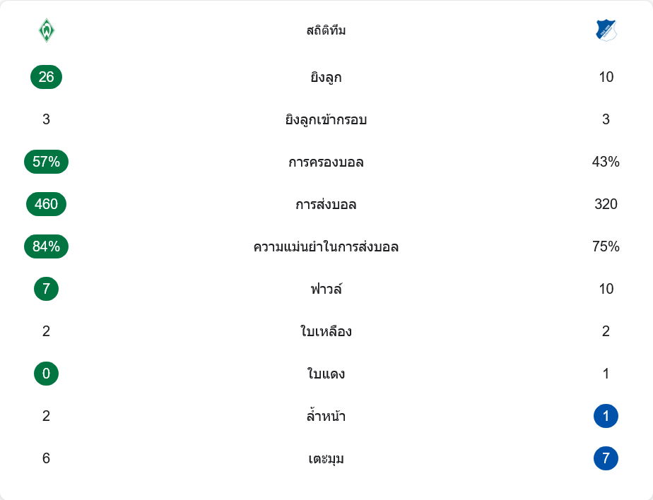 ตัวเลขหลังเกมสะท้อนภาพชัดเจนว่าเบรเมนครองบอลเหนือกว่าชัด ๆ ด้วยการครองบอล 57% ต่อ 43% และจ่ายบอลมากกว่าถึง 460 ต่อ 320 ครั้ง แถมความแม่นยำการจ่ายยังสูงถึง 84% แต่กลับแปรเปลี่ยนเป็นประตูไม่ได้เลย แม้จะสับไกถึง 26 ครั้ง เข้ากรอบแค่ 3 ครั้งเท่ากับฮอฟเฟ่นไฮม์ ขณะที่ทีมเยือนยิงเพียง 10 ครั้งแต่เปลี่ยนเป็น 2 ประตูเต็ม ๆ เกมนี้มีใบเหลืองฝั่งละ 2 ใบ เบอร์เกอร์โดน VAR อัปเกรดเป็นใบแดง ทำให้ฮอฟเฟ่นไฮม์ต้องเล่น 10 คนร่วมเกือบ 40 นาที ทว่าพวกเขายังรับแน่นจนรอดมาได้ เตะมุมสูสี เบรเมนได้ 6 ครั้ง ส่วนฮอฟเฟ่นไฮม์ 7 ครั้ง แสดงให้เห็นว่าทั้งสองทีมใช้ลูกนิ่งเป็นอาวุธสำคัญตลอด 90 นาที