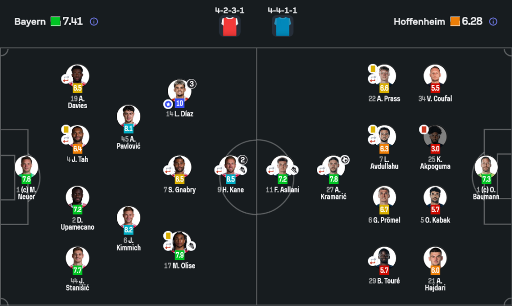 - มานูเอล นอยเออร์ (กัปตัน) – เรตติ้ง 7.6 เซฟจังหวะสำคัญ ทำให้ทีมเล่นสบายในช่วงที่สกอร์ยังไม่ขาด