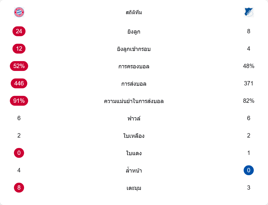 ตัวเลขหลังเกมบอกทุกอย่าง บาเยิร์นครองบอล 52% ต่อ 48% แม้ส่วนแบ่งบอลจะไม่ทิ้งกันมาก แต่ปริมาณโอกาสยิงคือจุดต่างสำคัญ เจ้าบ้านกดไปถึง 24 ครั้ง เข้ากรอบ 12 ลูก ขณะที่ฮอฟเฟ่นไฮม์มีโอกาสยิงเพียง 8 ครั้ง เข้ากรอบ 4 ครั้งเท่านั้น เสือใต้จ่ายบอล 446 ครั้งด้วยความแม่นยำสูงถึง 91% แสดงให้เห็นว่าเกมเซ็ตอัพจากแดนหลังสู่แดนหน้าไหลลื่นอย่างยิ่ง ส่วนทีมเยือนจ่ายบอล 371 ครั้ง แม่นยำ 82% แต่ส่วนใหญ่เป็นบอลแก้ไขสถานการณ์มากกว่าบอลสร้างสรรค์เกมรุก