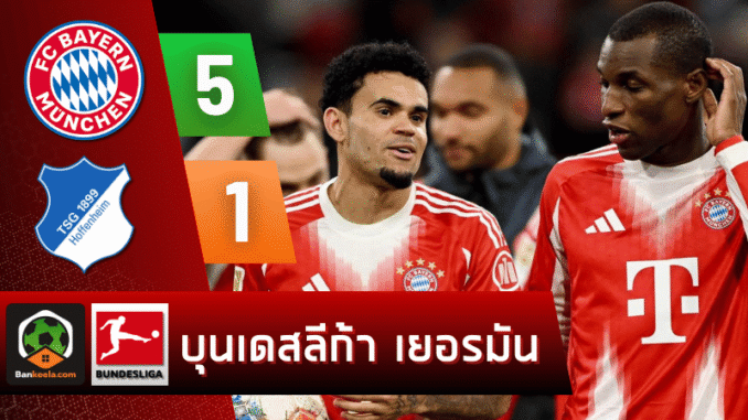 เควิน อัคโปกูมา โดนใบแดงตั้งแต่ยังไม่ถึงยี่สิบนาที ทำให้ฮอฟเฟ่นไฮม์ต้องเล่น 10 คนตั้งแต่หัววัน ก่อนที่ แฮร์รี เคน จะรับบทเพชฌฆาตซัดจุดโทษสองลูก ส่วน หลุยส์ ดิอาซ ระเบิดฟอร์มกดแฮตทริกพาบาเยิร์นยิงยับ 5-1 พร้อมย้ำสถานะเต็งแชมป์แบบไม่เกรงใจคู่แข่งในสายตาคอบอลที่ติดตาม บ้านผลบอล กันทั้งประเทศ