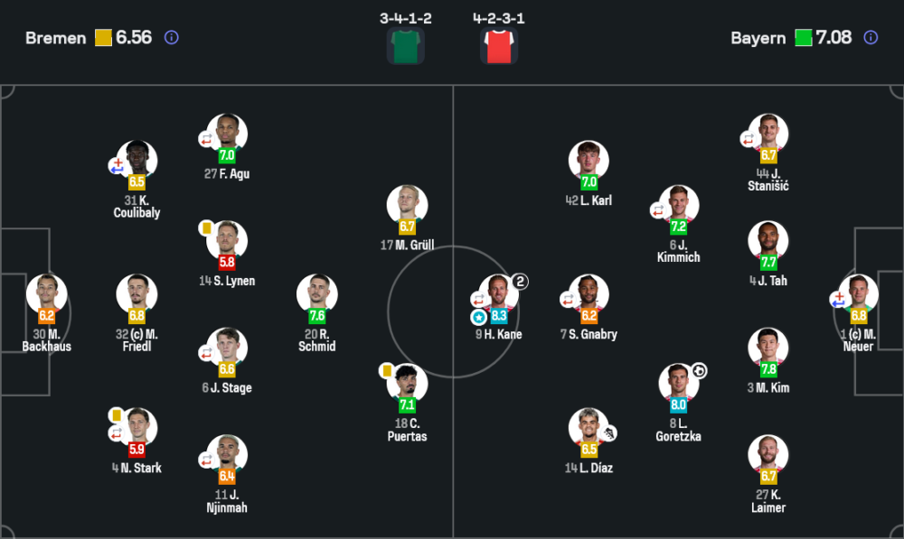 - ลูคัส คาร์ล (42) – 7.0 เรียกจุดโทษสำคัญในนาที 20 และสร้างปัญหาให้แนวรับเบรเมน