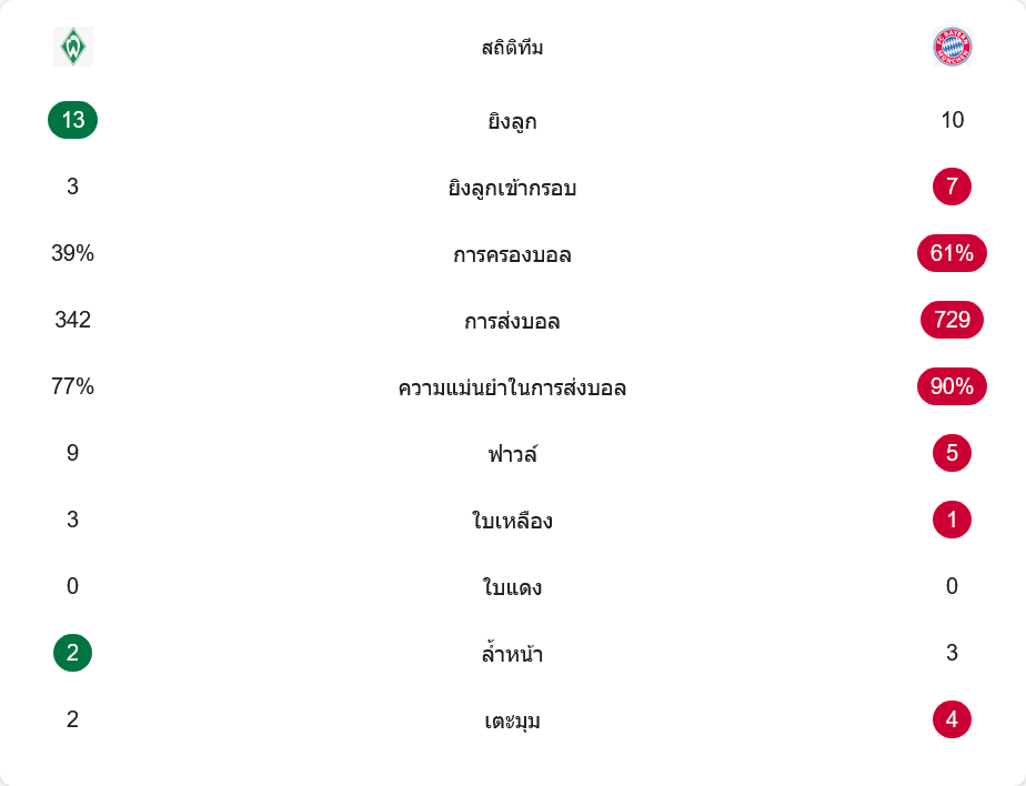 เกมรับเสือใต้ยังคงมาตรฐานสูง แดนกลางช่วยกันเพรสจนเบรเมนต้องยิงไกลเป็นส่วนใหญ่ แม้สถิติยิงรวมจะตามหลังเพียงเล็กน้อย แต่ความคมในพื้นที่สุดท้ายต่างกันชัดเจน บาเยิร์นใช้โอกาสไม่เปลือง ขณะที่เจ้าบ้านต้องพึ่งจังหวะผิดพลาดของคู่แข่งซึ่งแทบไม่เกิดขึ้น