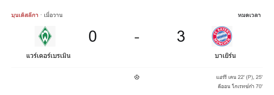 ช่วงทดเจ็บ 90+ C. ปูเอร์ตาส โดนใบเหลืองจากการเข้าสกัดช้า ก่อนผู้ตัดสินเป่าจบเกมหลังทดเวลา 5 นาทีเต็ม จบ 90 นาที แวร์เดอร์ เบรเมน พ่ายคาบ้าน 0-3 ต่อบาเยิร์น มิวนิค เสือใต้เก็บสามแต้มแบบเหนือชั้น