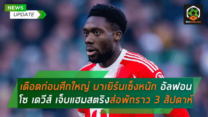สื่อเยอรมนีรายงานว่า อัลฟอนโซ เดวีส์ แบ็กซ้ายความเร็วสูงของบาเยิร์น มิวนิค มีแนวโน้มต้องพักรักษาตัวราว 3 สัปดาห์ หลังได้รับบาดเจ็บบริเวณกล้ามเนื้อแฮมสตริง