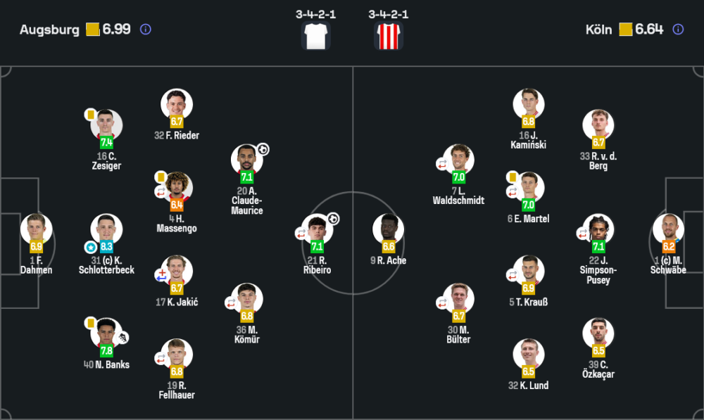 เคเวน ชล็อตเตอร์เบ็ค (เอาก์สบวร์ก) คะแนน 8.3 บ้านกีฬาให้คำเดียวว่า “คุมหลังเหมือนติดรีโมต” ยืนตำแหน่งนิ่ง อ่านบอลกลางอากาศดี ปิดช่องยิงในกรอบจนโคโลญจน์ต้องไปจบที่ลูกเปิดซ้ำ ๆ แถมยังช่วยประคองเกมช่วงที่ทีมยัง 0-0 ไม่ให้หลุดทรง ก่อนที่แนวรุกจะจัดให้สองเม็ดแบบจบงาน