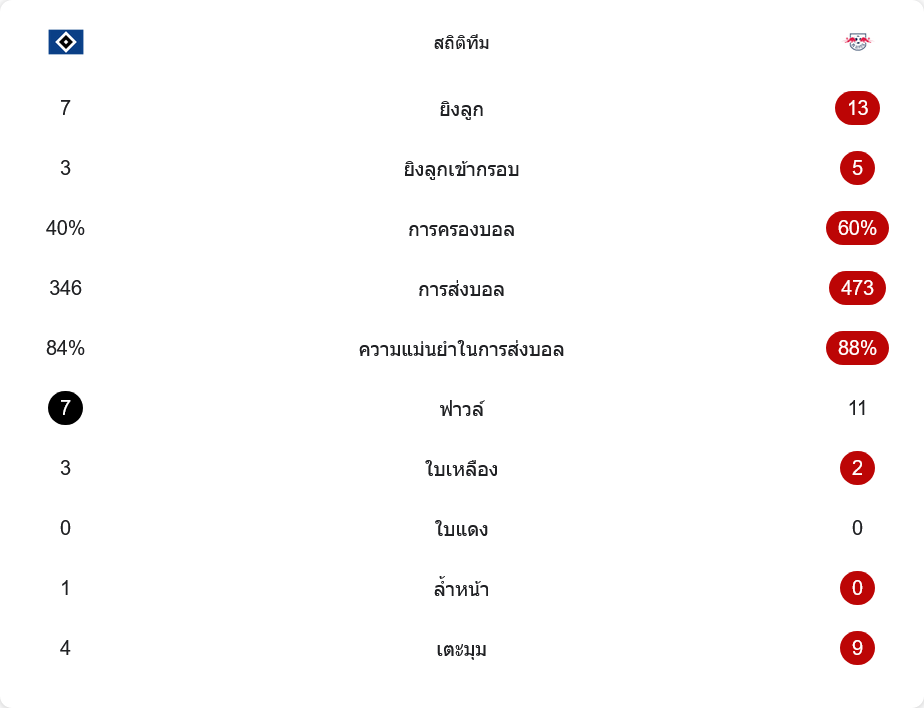 รูปเกมโดยรวมไลป์ซิกเหนือกว่าในเชิงปริมาณ พวกเขายิงทั้งหมด 13 ครั้ง เข้ากรอบ 5 ครั้ง ขณะที่ฮัมบูร์กยิง 7 ครั้ง เข้ากรอบ 3 ครั้ง การครองบอลเป็นของทีมเยือน 60 เปอร์เซ็นต์ต่อ 40 เปอร์เซ็นต์ และจำนวนการจ่ายบอลก็ทิ้งห่าง 473 ต่อ 346 พร้อมความแม่นยำ 88 เปอร์เซ็นต์เหนือกว่า 84 เปอร์เซ็นต์ ฮัมบูร์กต้องใช้ความดุดันเข้าสู้จนฟาวล์ 11 ครั้ง ส่วนไลป์ซิกฟาวล์ 7 ครั้ง ใบเหลืองฝั่งเจ้าถิ่น 3 ใบ ทีมเยือน 2 ใบ ไม่มีใบแดง ทั้งสองทีมล้ำหน้า ฮัมบูร์ก 1 ครั้ง ไลป์ซิก 0 ครั้ง และมุมเตะคือภาพชัดของแรงกดดัน ไลป์ซิกได้ถึง 9 ครั้ง ฮัมบูร์กได้ 4 ครั้ง