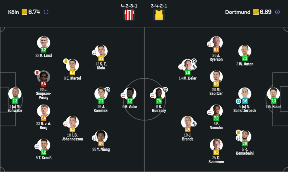 โคโลญจน์มาในระบบ 4-2-3-1 เน้นขึ้นเกมเร็วและโจมตีด้านข้าง มีช่วงต้นเกมที่กดดอร์ทมุนด์ได้ดี แต่ปัญหาชัดเจนคือจังหวะสุดท้ายไม่คมพอ ส่วนดอร์ทมุนด์ยืน 3-4-2-1 เล่นรัดกุมกว่าและใช้พื้นที่ระหว่างไลน์ได้มีประสิทธิภาพกว่า