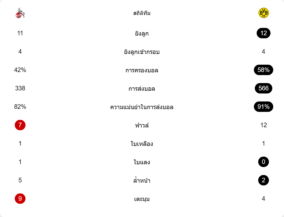เกมนี้สูสีพอตัว โคโลญจน์ยิง 11 ครั้ง ดอร์ทมุนด์ยิง 12 ครั้ง และยิงเข้ากรอบเท่ากันที่ 4 ครั้ง แต่ทีมเยือนคมกว่า ด้านการครองบอล ดอร์ทมุนด์เหนือกว่าที่ 58 เปอร์เซ็นต์ จ่ายบอล 566 ครั้ง ความแม่นยำ 91 เปอร์เซ็นต์ ขณะที่โคโลญจน์ครองบอล 42 เปอร์เซ็นต์ จ่าย 338 ครั้ง แม่นยำ 82 เปอร์เซ็นต์ แม้เจ้าบ้านจะได้เตะมุมมากถึง 9 ครั้ง เทียบกับดอร์ทมุนด์ 4 ครั้ง แต่ใช้ประโยชน์ได้ไม่เด็ดขาดพอ