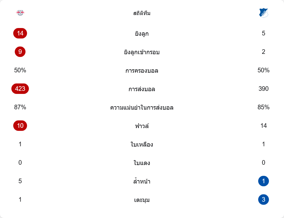 แม้การครองบอลจะเท่ากันที่ 50 เปอร์เซ็นต์ แต่คุณภาพเกมต่างกันชัดเจน ไลป์ซิกยิง 14 ครั้ง เข้ากรอบ 9 หน ส่วนฮอฟเฟ่นไฮม์ยิง 5 ครั้ง เข้ากรอบ 2 หน เจ้าถิ่นผ่านบอล 423 ครั้งด้วยความแม่นยำ 87 เปอร์เซ็นต์ ขณะที่ทีมเยือนผ่าน 390 ครั้งแม่นยำ 85 เปอร์เซ็นต์ ฮอฟเฟ่นไฮม์ได้เตะมุมมากกว่าที่ 3 ต่อ 1 แต่เปลี่ยนเป็นประตูไม่ได้เลย สะท้อนว่าไลป์ซิกมีประสิทธิภาพกว่าอย่างชัดเจน