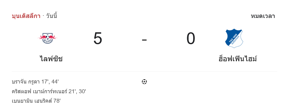 - ⚽ นาที 21 คริสตอฟ เบาม์การ์ทเนอร์ โหม่งให้ไลป์ซิกหนี 2-0