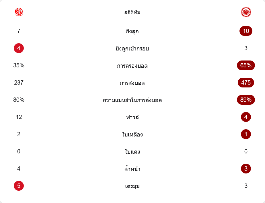 ในเกมรับ ไมนซ์อาจปล่อยให้คู่แข่งครองบอลมากกว่า แต่ยังปิดพื้นที่อันตรายได้ดี แนวรับช่วยกันซ้อนและยอมตัดฟาวล์เมื่อจำเป็น ทำให้แฟร้งค์เฟิร์ตแม้ต่อบอลได้เยอะ แต่จังหวะเข้าพื้นที่สุดท้ายไม่ได้คมเท่าที่ควร