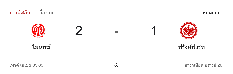 - 🏁 หมดเวลา ไมนซ์ ชนะ แฟร้งค์เฟิร์ต 2-1