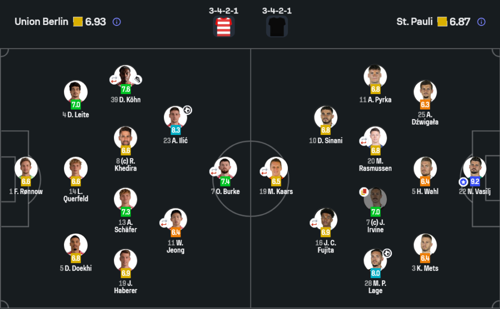 - เปลี่ยนตัว : อเล็กซ์ คราล 6.4, อิเลียส อันซาห์ 6.4, ทอม โรเธอ 6.7