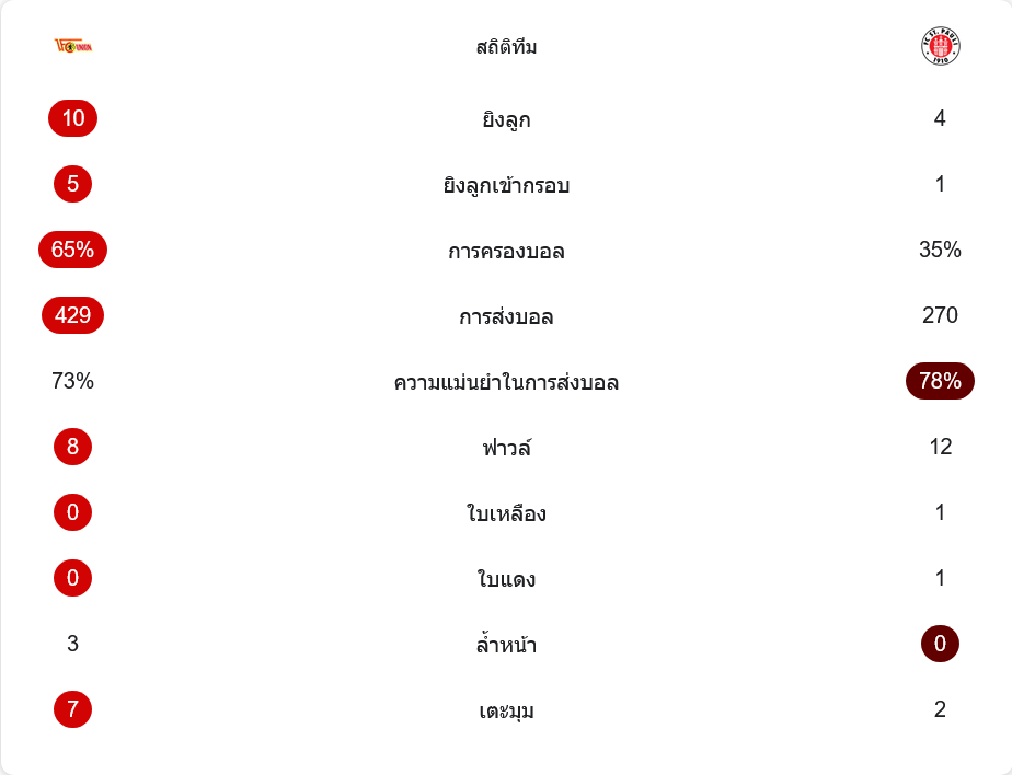ซังต์ เพาลีมาในแผน 3-4-2-1 เช่นกัน แต่เน้นตั้งรับให้แน่น รอจังหวะสวนกลับ และใช้ความนิ่งในแดนกลางช่วยตัดเกม ประตูของ เปเรรา ลาเก คือภาพชัดของการเล่นแบบนี้ ส่วนเกมรับแม้โดนบุกหนัก แต่ยังยืนระเบียบได้ดี โดยเฉพาะผู้รักษาประตูที่ช่วยเซฟแต้มสำคัญเอาไว้