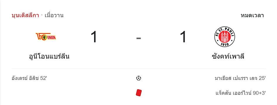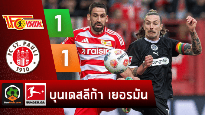 ศึก บุนเดสลีกา นัดนี้จบแบบดุเดือด เมื่อ ยูเนี่ยน เบอร์ลิน เปิดบ้านเสมอ ซังต์ เพาลี 1-1 ในเกมที่เต็มไปด้วยแรงปะทะ จังหวะกดดัน และดราม่าท้ายเกม โดยแฟนบอลที่ตามเช็ก ผลบอลสด คู่นี้ได้เห็นครบทั้งประตูสุดสวย ลูกโหม่งตีเสมอ และใบแดงช่วงทดเวลา