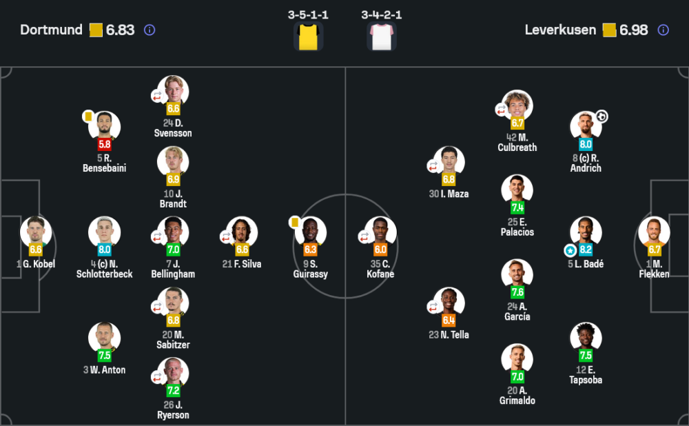 โลอิก บาเด้ คว้ารางวัลผู้เล่นยอดเยี่ยมประจำเกมด้วยคะแนน 8.2 และถือว่าเหมาะสมเต็มที่ เขาคุมแนวรับได้แข็งแกร่ง อ่านเกมแม่น สกัดจังหวะอันตรายได้ต่อเนื่อง และช่วยให้เลเวอร์คูเซ่นรับแรงกดดันจากดอร์ทมุนด์ได้อย่างอยู่หมัด เป็นกำลังหลักของคลีนชีตนัดนี้อย่างแท้จริง