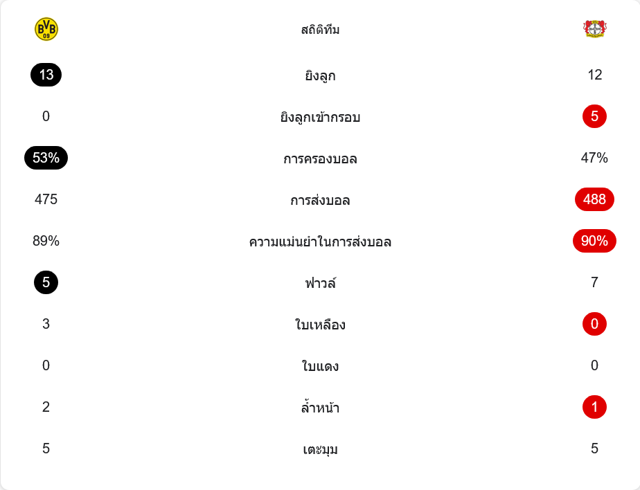 เกมนี้ดอร์ทมุนด์ยิง 13 ครั้ง มากกว่าเลเวอร์คูเซ่นที่ยิง 12 ครั้ง และครองบอล 53 เปอร์เซ็นต์ แต่ปัญหาใหญ่คือยิงเข้ากรอบไม่ได้เลยแม้แต่ครั้งเดียว ต่างจากทีมเยือนที่ยิงเข้ากรอบ 5 หน และเปลี่ยนหนึ่งในนั้นเป็นประตูชัย ทั้งสองทีมได้เตะมุมเท่ากันที่ 5 ครั้ง การผ่านบอลใกล้เคียงกัน ดอร์ทมุนด์จ่าย 475 ครั้งแม่น 89 เปอร์เซ็นต์ ส่วนเลเวอร์คูเซ่นจ่าย 488 ครั้งแม่น 90 เปอร์เซ็นต์ ภาพรวมจึงเป็นเกมสูสี แต่ต่างกันที่ความเฉียบคมล้วน ๆ