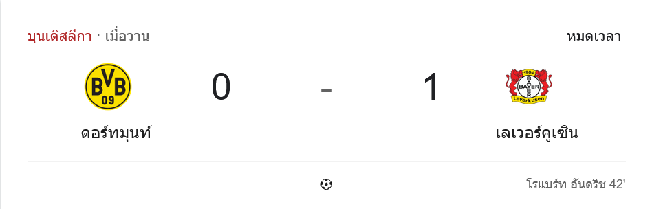 ศึก บุนเดสลีกา คู่นี้จบแบบเจ็บแสบสำหรับแฟนเสือเหลือง เมื่อ โบรุสเซีย ดอร์ทมุนด์ เปิดบ้านพ่าย ไบเออร์ เลเวอร์คูเซ่น 0-1 จากประตูโทนของ โรเบิร์ต อันดริช นาที 42 แม้รูปเกมเจ้าถิ่นจะบุกมากกว่าในหลายช่วง แต่ความคมในจังหวะสุดท้ายกลับหายไปหมด ขณะที่ทีมเยือนเล่นอย่างนิ่ง มีวินัย และลงโทษได้เด็ดขาด คนที่ตาม ผลบอลสด เกมนี้คงเห็นชัดว่า ดอร์ทมุนด์มีแรงบุก แต่เลเวอร์คูเซ่นมีคุณภาพมากกว่าในจังหวะตัดสินเกม