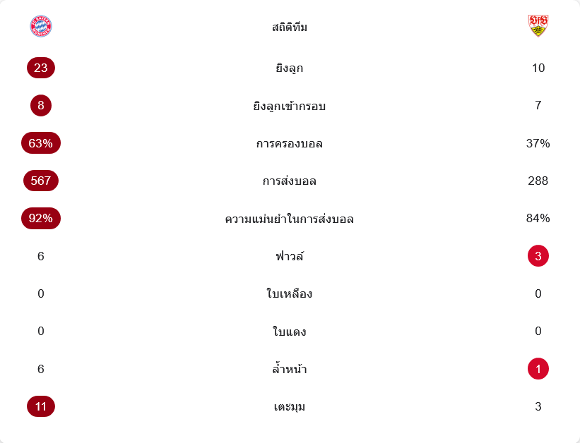 เกมนี้บาเยิร์นเหนือกว่าชัดเจนทั้งรูปเกมและตัวเลข พวกเขายิง 23 ครั้ง เข้ากรอบ 8 ครั้ง ครองบอล 63 เปอร์เซ็นต์ และผ่านบอล 567 ครั้งด้วยความแม่นยำ 92 เปอร์เซ็นต์ ขณะที่สตุ๊ตการ์ทยิง 10 ครั้ง เข้ากรอบ 7 ครั้ง ครองบอล 37 เปอร์เซ็นต์ ผ่านบอล 288 ครั้ง ความแม่นยำ 84 เปอร์เซ็นต์ เจ้าบ้านยังได้เตะมุมมากถึง 11 ครั้ง เทียบกับ 3 ครั้งของทีมเยือน สะท้อนว่าบาเยิร์นเป็นฝ่ายกดเกมไว้แทบตลอดทั้งแมตช์