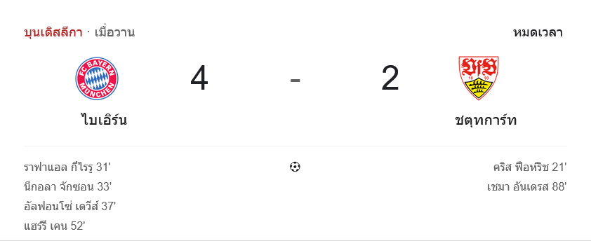 จาก : ผลบอลสด บุนเดสลีกา ระหว่าง บาเยิร์น มิวนิค 4-2 สตุ๊ตการ์ท วันนี้ 19/4/69 – บ้านกีฬา