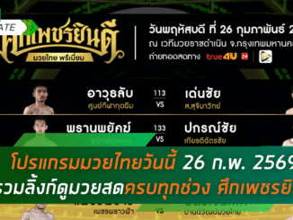 โปรแกรมมวยไทยวันนี้ 26 ก.พ. 2569 รวมลิ้งก์ดูมวยสดครบทุกช่วง ศึกเพชรยินดีเดือดราชดำเนิน