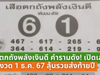 แนวทางหวย เสือตกถังพลังเงินดี งวด 1 ธ.ค. 67 จัดเต็มเลขเด่น 6 และ 1 พร้อมชุดเลขท้าย 2 ตัว และ 3 ตัวครบครัน ลุ้นโชคส่งท้ายปี