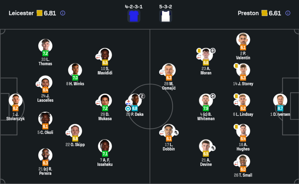 เปรสตันใช้ระบบ 5-3-2 เน้นรับลึก รอจังหวะสวนกลับ และเล่นลูกนิ่งได้มีประสิทธิภาพ แม้จะครองบอลน้อยกว่า แต่ทุกครั้งที่ขึ้นมาดูมีพิษมีภัย เกมรับของพวกเขามีวินัยดี โดยเฉพาะการยืนตำแหน่งและการบล็อกจังหวะยิง อย่างไรก็ตาม เมื่อโดนกดต่อเนื่องในครึ่งหลัง แนวรับก็เริ่มถอยลึกเกินไปและเปิดโอกาสให้เลสเตอร์ยิงมากเกินควร