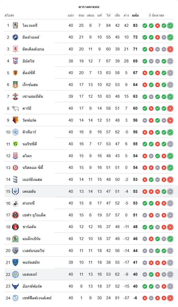ผลเสมอทำให้เลสเตอร์มี 40 แต้มจาก 40 นัด รั้งอันดับ 22 ต่อไปและยังอยู่ในโซนตกชั้น สถานการณ์ยังน่ากดดันอย่างมาก เพราะทุกแต้มจากนี้มีผลโดยตรงต่อการอยู่รอด ส่วนเปรสตันเก็บเพิ่มเป็น 53 แต้มจาก 40 นัด รั้งอันดับ 15 ของตาราง ยังประคองตัวอยู่ในโซนกลางได้ค่อนข้างปลอดภัย