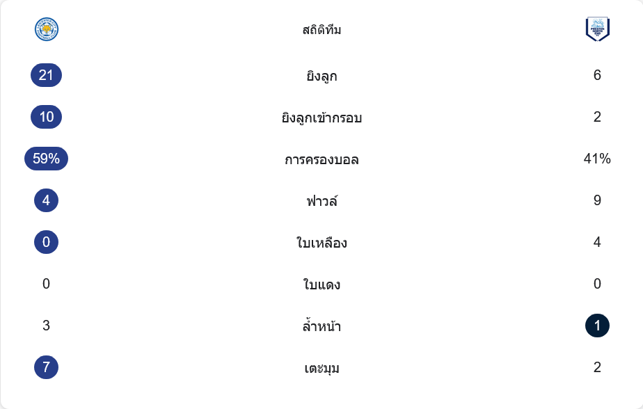 เกมนี้เลสเตอร์เหนือกว่าพอสมควรในเชิงตัวเลข ครองบอล 59 เปอร์เซ็นต์ และยิงมากถึง 21 ครั้ง เข้ากรอบ 10 ครั้ง ขณะที่เปรสตันมีเพียง 6 ครั้ง เข้ากรอบ 2 ครั้งเท่านั้น เจ้าถิ่นยังได้เตะมุม 7 ครั้ง เทียบกับ 2 ครั้งของทีมเยือน แต่ความต่างคือเปรสตันใช้โอกาสสำคัญได้คมกว่า และมีผู้รักษาประตูช่วยเซฟหลายจังหวะ ขณะที่เรื่องวินัย เปรสตันโดน 4 ใบเหลือง ส่วนเลสเตอร์ไม่มีใบเหลืองเลย