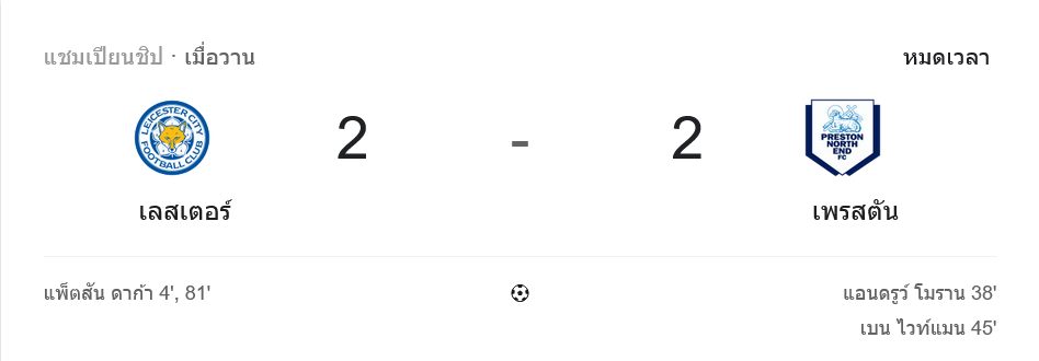 - ⏱️ นาที 90+7 จบเกม เลสเตอร์ ซิตี้ เสมอ เปรสตัน นอร์ธเอนด์ 2-2