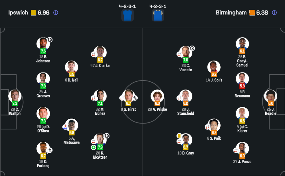 เคซีย์ แม็คอาเทียร์ คว้ารางวัลผู้เล่นยอดเยี่ยมประจำเกมด้วยคะแนน 7.9 หลังยิงประตูชัยและสร้างความอันตรายให้แนวรับเบอร์มิงแฮมตลอดทั้งเกม เขาเป็นตัวรุกที่ขยับหาพื้นที่เก่ง กล้าจบสกอร์ และเปลี่ยนจังหวะธรรมดาให้กลายเป็นจังหวะเด็ดขาดได้จริง
