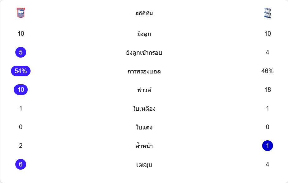 เกมนี้ทั้งสองทีมยิง 10 ครั้งเท่ากัน แต่ฝั่งอิปสวิชยิงเข้ากรอบ 5 ครั้ง มากกว่าเบอร์มิงแฮมที่เข้ากรอบ 4 ครั้งเล็กน้อย เจ้าถิ่นครองบอล 54 เปอร์เซ็นต์ ส่วนทีมเยือน 46 เปอร์เซ็นต์ อิปสวิชได้เตะมุม 6 ครั้ง ขณะที่เบอร์มิงแฮมได้ 4 ครั้ง ด้านการเข้าปะทะถือว่าหนักพอสมควร โดยเบอร์มิงแฮมฟาวล์ 18 ครั้ง อิปสวิช 10 ครั้ง และทั้งสองฝั่งมีใบเหลืองทีมละ 1 ใบ ไม่มีใบแดงเกิดขึ้น