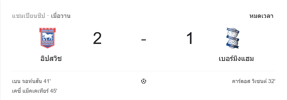 - ⚽ นาที 41 อิปสวิชตีเสมอ 1-1 เบน จอห์นสัน ยิงจ่อ ๆ ไม่พลาด