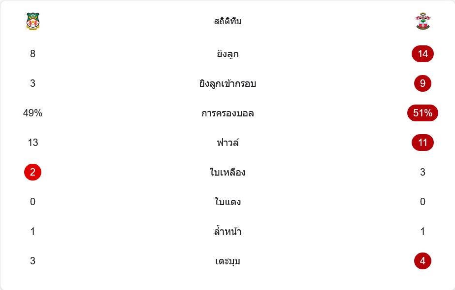 ภาพรวมของเกมนี้สะท้อนชัดว่าเซาแธมป์ตันใช้โอกาสได้คมกว่า พวกเขายิง 14 ครั้ง เข้ากรอบ 9 ครั้ง ขณะที่เร็กซ์แฮมยิง 8 ครั้ง เข้ากรอบ 3 ครั้ง การครองบอลใกล้เคียงกันที่ 51 ต่อ 49 เปอร์เซ็นต์ แต่ทีมเยือนเปลี่ยนบอลที่มีให้เป็นจังหวะอันตรายได้มากกว่า เร็กซ์แฮมฟาวล์ 13 ครั้ง ได้ 2 ใบเหลือง ส่วนเซาแธมป์ตันฟาวล์ 11 ครั้ง ได้ 3 ใบเหลือง และมีเตะมุมมากกว่านิดหน่อยที่ 4 ต่อ 3 ซึ่งทั้งหมดนี้บอกชัดว่าเกมสูสีแค่บางช่วง แต่ประสิทธิภาพต่างกันมาก