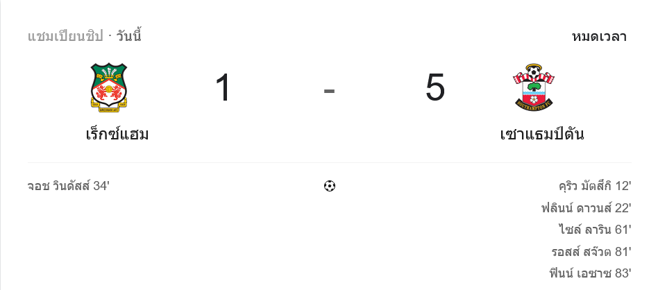 ผลบอลสด เกมนี้เป็นคืนที่เซาแธมป์ตันเล่นได้เหนือกว่าชัดเจน บุกมาถล่มเร็กซ์แฮม 5-1 ในศึก แชมเปี้ยนชิพ อังกฤษ ด้วยความคมในพื้นที่สุดท้ายและจังหวะเข้าทำที่เด็ดขาดกว่าแทบทุกช่วงของเกม เจ้าถิ่นมีจังหวะฮึดกลับมาเหมือนกัน แต่สุดท้ายต้านเกมรุกของทีมเยือนไม่อยู่