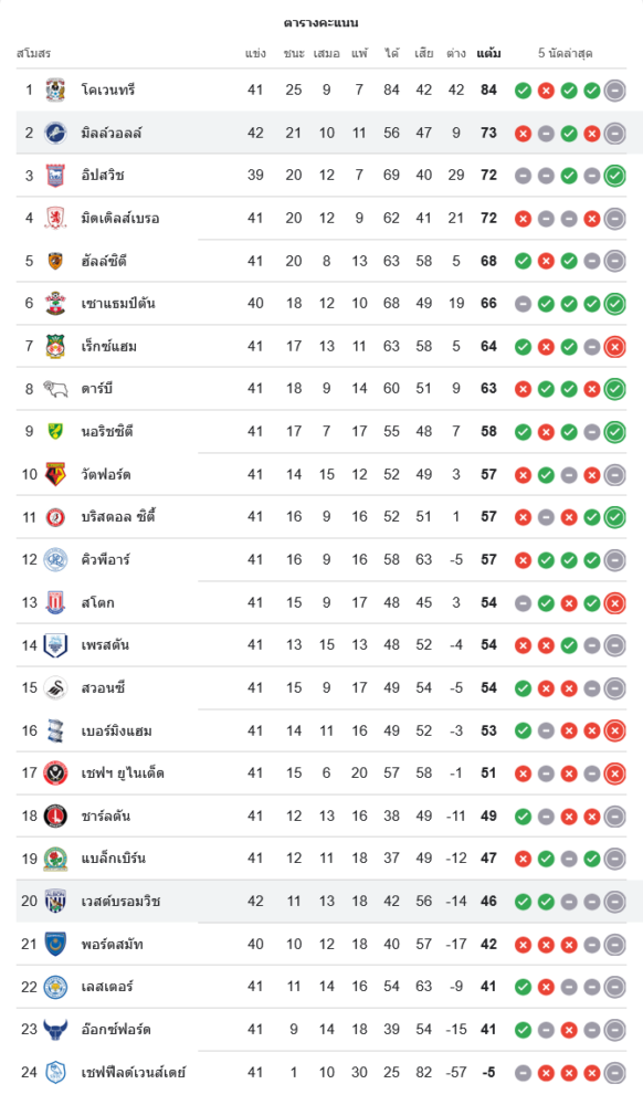 ผลเสมอนัดนี้ทำให้มิลล์วอลล์มี 73 คะแนนจาก 42 นัด รั้งอันดับ 2 ต่อไป แต่ยังต้องลุ้นหนัก เพราะอิปสวิชและมิดเดิลสโบรช์ไล่มาติด ๆ ที่ 72 คะแนน ส่วนเวสต์บรอมวิชเก็บเพิ่มเป็น 46 คะแนนจาก 42 นัด อยู่อันดับ 20 ของตาราง แต้มนี้จึงสำคัญอย่างมากต่อการประคองตัวในช่วงโค้งสุดท้ายของฤดูกาล