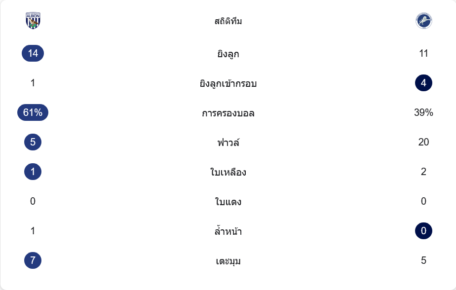 เกมนี้เวสต์บรอมยิง 14 ครั้ง มากกว่ามิลล์วอลล์ที่ยิง 11 ครั้ง แต่ทีมเยือนยิงเข้ากรอบมากกว่าที่ 4 ต่อ 1 เจ้าถิ่นครองบอลเหนือกว่าชัดเจน 61 เปอร์เซ็นต์ต่อ 39 เปอร์เซ็นต์ และได้เตะมุม 7 ครั้ง เทียบกับมิลล์วอลล์ 5 ครั้ง เวสต์บรอมฟาวล์เพียง 5 หน ขณะที่มิลล์วอลล์ฟาวล์ถึง 20 ครั้ง สะท้อนว่าเกมนี้เต็มไปด้วยความหนักและการปะทะ ด้านใบเหลือง เวสต์บรอมโดน 1 ใบ ส่วนมิลล์วอลล์ 2 ใบ ไม่มีใบแดงจากทั้งสองฝั่ง สถิติโดยรวมจึงชี้ชัดว่าเจ้าถิ่นบุกมากกว่า แต่ทีมเยือนมีความอันตรายในจังหวะสุดท้ายมากกว่า