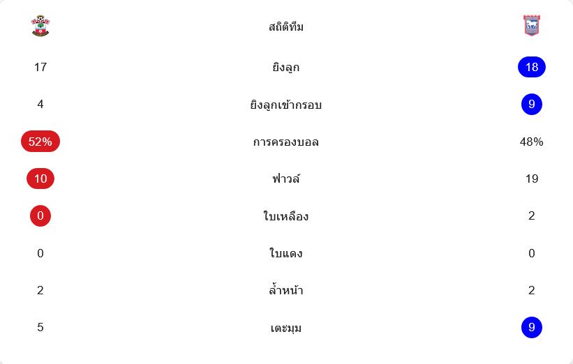 เกมนี้ทั้งสองทีมแลกกันสนุก เซาธ์แฮมป์ตันครองบอล 52% ส่วนอิปสวิชมี 48% แต่ทีมเยือนยิงมากกว่า 18 ครั้ง เข้ากรอบ 9 ครั้ง ขณะที่เจ้าบ้านยิง 17 ครั้ง เข้ากรอบ 4 ครั้ง อิปสวิชยังได้เตะมุมถึง 9 ครั้ง มากกว่าเซาธ์แฮมป์ตันที่ได้ 5 ครั้ง ด้านวินัยเกมรับ ทีมเยือนทำฟาวล์ 19 ครั้งและโดน 2 ใบเหลือง ส่วนเจ้าบ้านทำฟาวล์ 10 ครั้ง ไม่มีใบเหลืองหรือใบแดง