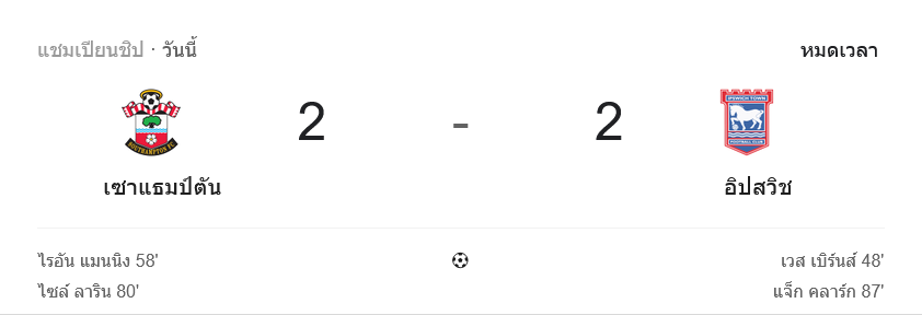 จาก : ผลบอลสด แชมเปี้ยนชิพ อังกฤษ ระหว่าง เซาธ์แฮมป์ตัน 2-2 อิปสวิช ทาวน์ วันนี้ 29/4/69 – บ้านกีฬา