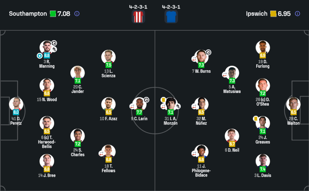 เซาธ์แฮมป์ตันมาในระบบ 4-2-3-1 โดยใช้ ไรอัน แมนนิ่ง เป็นแกนสำคัญทางฝั่งซ้าย ทั้งเติมเกม เปิดบอล และเล่นลูกตั้งเตะ เกมนี้เขาคือคนเปลี่ยนจังหวะให้เจ้าบ้านอย่างแท้จริง ทั้งยิงฟรีคิกตีเสมอและแอสซิสต์ให้ ลาริน ยิงแซง