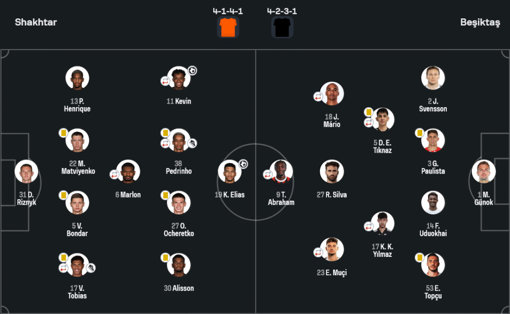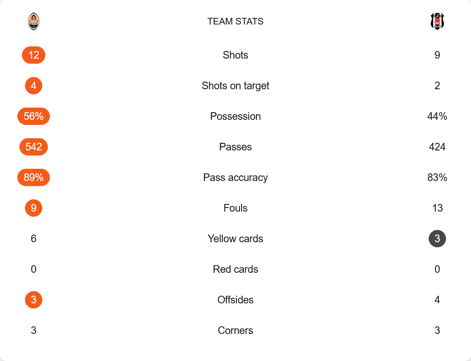 ชักตาร์ โดเน็ตส์กครองเกมด้วยเปอร์เซ็นต์บอล 56% สะท้อนถึงการควบคุมจังหวะและความนิ่ง พวกเขามีโอกาสยิง 12 ครั้ง เข้ากรอบ 4 ส่วนเบซิคตัสยิงได้ 9 ครั้ง เข้ากรอบแค่ 2 หน จำนวนการผ่านบอลของโดเน็ตส์กมากถึง 542 ครั้ง แม่นยำ 89% ขณะที่เบซิคตัสจ่าย 424 ครั้ง แม่นยำ 83% เกมนี้ยังเต็มไปด้วยการปะทะรวมฟาวล์ทั้งหมด 22 ครั้ง ใบเหลืองโดเน็ตส์ก 6 ใบ ส่วนเบซิคตัส 3 ใบ