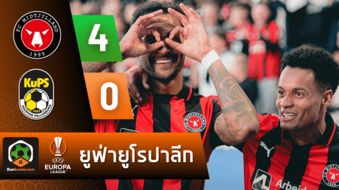 บ้านกีฬาเกาะติดเกมเพลย์ออฟยูฟ่ายูโรปาลีก เลก 1 ที่เดนมาร์ก มิดทิลแลนด์กดคูพีเอส 4-0 แบบไม่ไว้หน้า สัญญาณจาก ผลบอลสด บอกชัด—เจ้าถิ่นคมกริบ จบสกอร์ไม่ปรานี วางแต้มต่อก่อนยกพลไปเยือนเลกสองที่ฟินแลนด์
